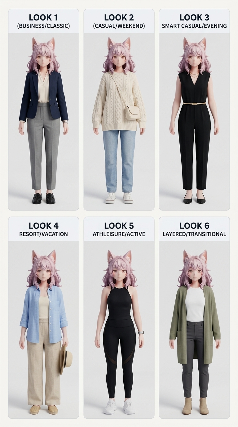 Using the uploaded photo as the sole character reference, generate a vertical outfit poster. 【LAYOUT HARD RULES】 - Must have exactly 6 cards only, 2 rows × 3 columns (3 columns across, 2 rows down) - Row 1: LOOK 1, 2, 3 | Row 2: LOOK 4, 5, 6 - Prohibited: 9-grid, 3 rows × 2 columns, 2-column layout, extra cards, top header/title 【CANVAS & LAYOUT】 - Vertical 4:5 aspect ratio, background #F7F5F2 - Grid occupies ≥92% of canvas height, bottom margin ≤3% - Outer margin 2%, spacing 1.5%, strictly aligned 【CARD SPECIFICATIONS】 - White background #FFFFFF, border-radius 5%, stroke 1px #E5E7EB - Top title bar: height 12%, background #F3F4F6, text color #111827 - Sans-serif font, alignment consistent throughout 【CHARACTER CONSISTENCY】 - All 6 must be the same person in different outfits: same face, same hairstyle, same body proportions, same demeanor - Prohibited: switching people/changing face/altering gender features/extreme slimming or leg lengthening 【PHOTOGRAPHY QUALITY】 - Master-level studio full-body lookbook, 85mm portrait lens look - Softbox key light + subtle fill, natural skin texture with light retouching - Solid seamless background (white/light gray/off-white), no clutter 【UNIFORM CROPPING】 - 4:5 full-body, complete from head to shoes - Subject centered, height 88%±2% - Headroom 2-4%, footroom 3-5%, shoes fully visible - All six shots: consistent camera height/focal length/lighting/pose 【OUTFIT RULES】 - Auto-adapt based on subject age (adult/child) - Each look ≤3 core items, max 3 colors per outfit, accessories ≤2 - 6 looks distinctly different, but unified style: minimal/clean/polished/easy to recreate 【TITLE SETS】 Adult: Business/Classic → Casual/Weekend → Smart Casual/Evening → Resort/Vacation → Athleisure/Active → Layered/Transitional Kids: Everyday/Clean → School/Polished → Weekend/Play → Party/Sweet → Active/Sporty → Layered/Cozy NEGATIVE: 3x3, nine-grid, 9 cards, extra cards, 3 rows x 2 columns, two-column layout, big top header, page title, switching people, changing face, multiple people, lowres, blurry, plastic skin, wide-angle distortion, fisheye, warped body, extreme slimming, long legs effect, outdoor background, textured wall, cut off shoes, half body, adultification, sexy, lingerie, see-through, high heels (kids), heavy makeup (kids), watermark, cropped text