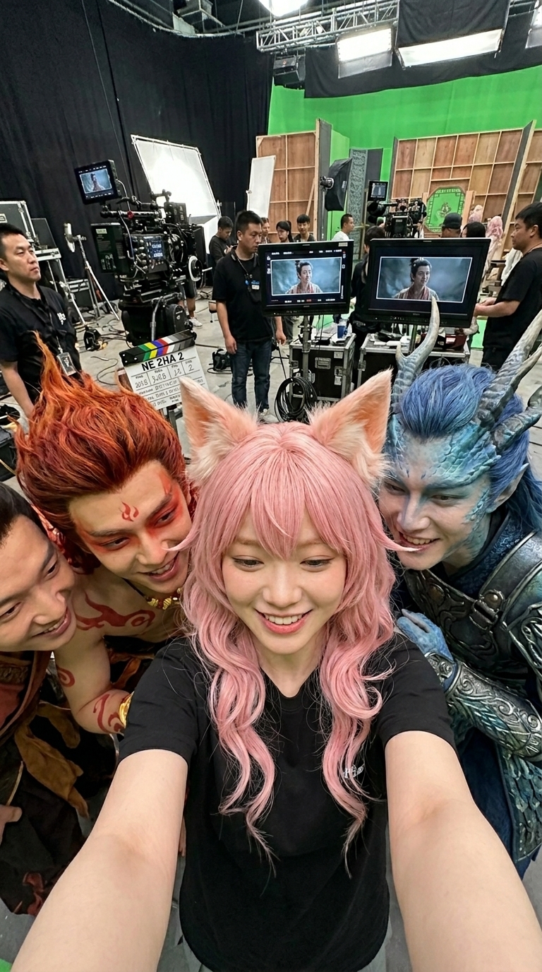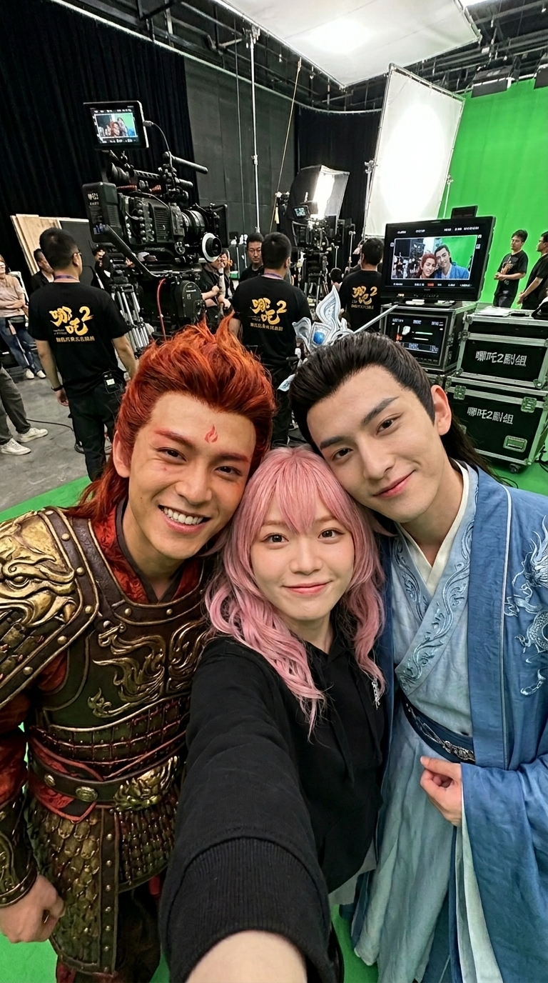 Create a realistic first-person POV selfie as if the camera is my own eyes using a phone’s front-facing camera. The phone, my hands, and my arms must NOT be visible in the frame. Use the uploaded image as my identity reference and keep my face recognizable through perspective consistency. I am not part of the cast I’m a guest on set wearing modern, casual real-world clothing that does not match the actors’ wardrobe. The actors are aware of the selfie, standing very close to me, leaning in naturally, and looking directly into the camera as if pausing for a quick friendly shot between takes.