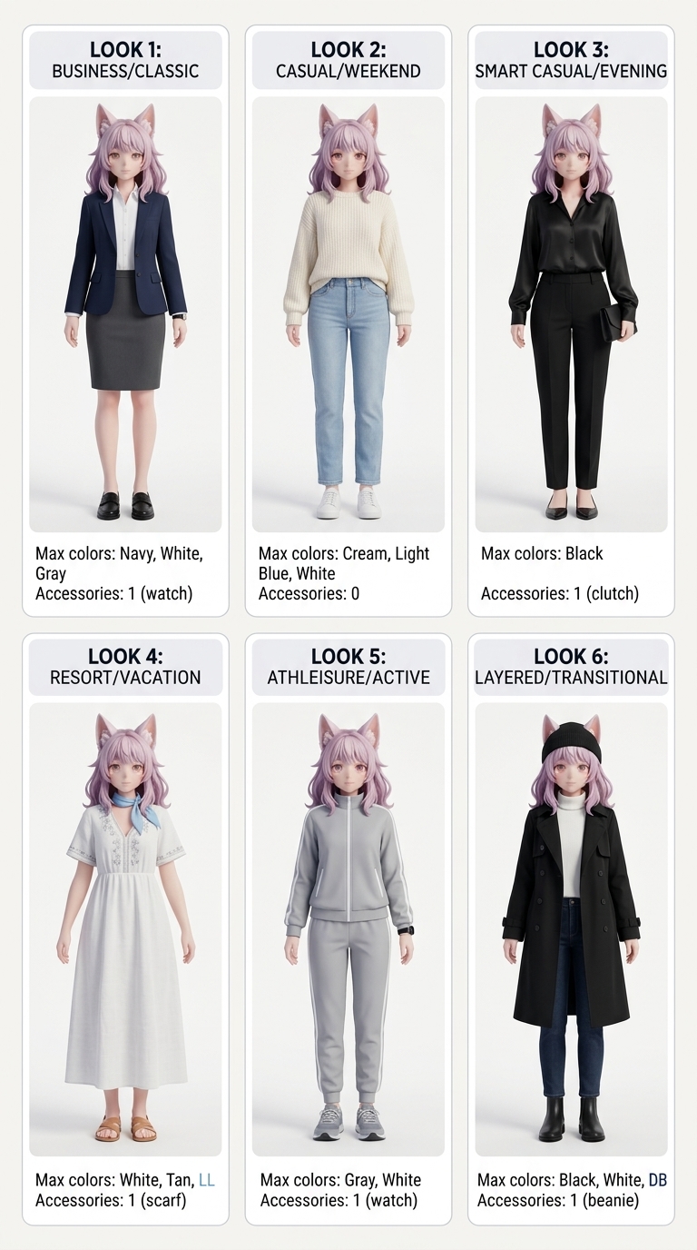 Using the uploaded photo as the sole character reference, generate a vertical outfit poster. 【LAYOUT HARD RULES】 - Must have exactly 6 cards only, 2 rows × 3 columns (3 columns across, 2 rows down) - Row 1: LOOK 1, 2, 3 | Row 2: LOOK 4, 5, 6 - Prohibited: 9-grid, 3 rows × 2 columns, 2-column layout, extra cards, top header/title 【CANVAS & LAYOUT】 - Vertical 4:5 aspect ratio, background #F7F5F2 - Grid occupies ≥92% of canvas height, bottom margin ≤3% - Outer margin 2%, spacing 1.5%, strictly aligned 【CARD SPECIFICATIONS】 - White background #FFFFFF, border-radius 5%, stroke 1px #E5E7EB - Top title bar: height 12%, background #F3F4F6, text color #111827 - Sans-serif font, alignment consistent throughout 【CHARACTER CONSISTENCY】 - All 6 must be the same person in different outfits: same face, same hairstyle, same body proportions, same demeanor - Prohibited: switching people/changing face/altering gender features/extreme slimming or leg lengthening 【PHOTOGRAPHY QUALITY】 - Master-level studio full-body lookbook, 85mm portrait lens look - Softbox key light + subtle fill, natural skin texture with light retouching - Solid seamless background (white/light gray/off-white), no clutter 【UNIFORM CROPPING】 - 4:5 full-body, complete from head to shoes - Subject centered, height 88%±2% - Headroom 2-4%, footroom 3-5%, shoes fully visible - All six shots: consistent camera height/focal length/lighting/pose 【OUTFIT RULES】 - Auto-adapt based on subject age (adult/child) - Each look ≤3 core items, max 3 colors per outfit, accessories ≤2 - 6 looks distinctly different, but unified style: minimal/clean/polished/easy to recreate 【TITLE SETS】 Adult: Business/Classic → Casual/Weekend → Smart Casual/Evening → Resort/Vacation → Athleisure/Active → Layered/Transitional Kids: Everyday/Clean → School/Polished → Weekend/Play → Party/Sweet → Active/Sporty → Layered/Cozy NEGATIVE: 3x3, nine-grid, 9 cards, extra cards, 3 rows x 2 columns, two-column layout, big top header, page title, switching people, changing face, multiple people, lowres, blurry, plastic skin, wide-angle distortion, fisheye, warped body, extreme slimming, long legs effect, outdoor background, textured wall, cut off shoes, half body, adultification, sexy, lingerie, see-through, high heels (kids), heavy makeup (kids), watermark, cropped text