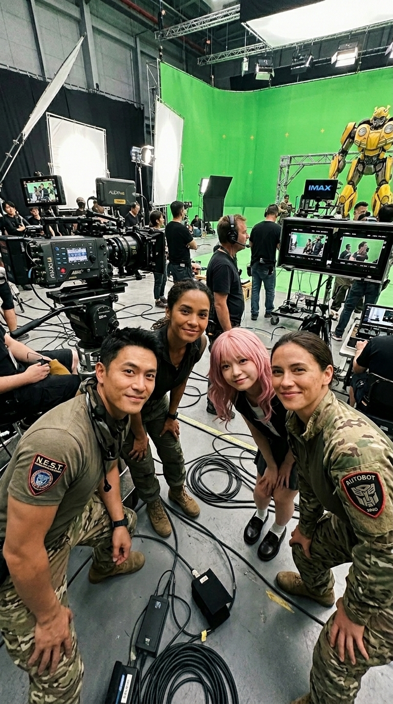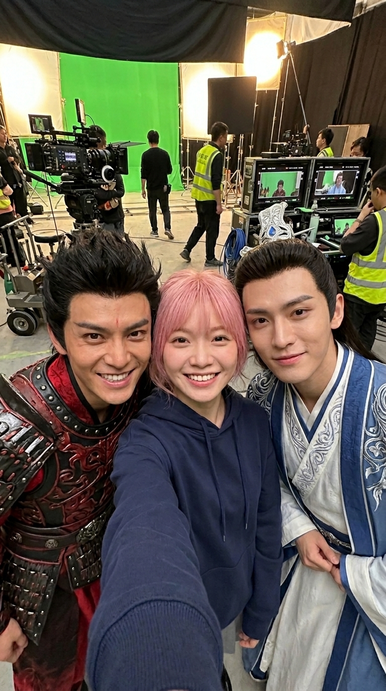 Create a realistic first-person POV selfie as if the camera is my own eyes using a phone’s front-facing camera. The phone, my hands, and my arms must NOT be visible in the frame. Use the uploaded image as my identity reference and keep my face recognizable through perspective consistency. I am not part of the cast I’m a guest on set wearing modern, casual real-world clothing that does not match the actors’ wardrobe. The actors are aware of the selfie, standing very close to me, leaning in naturally, and looking directly into the camera as if pausing for a quick friendly shot between takes.